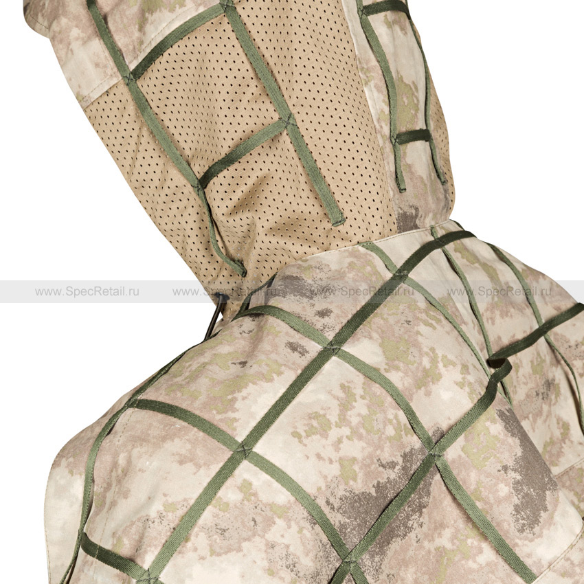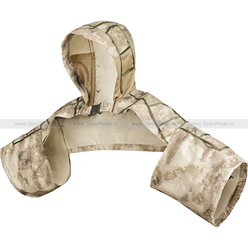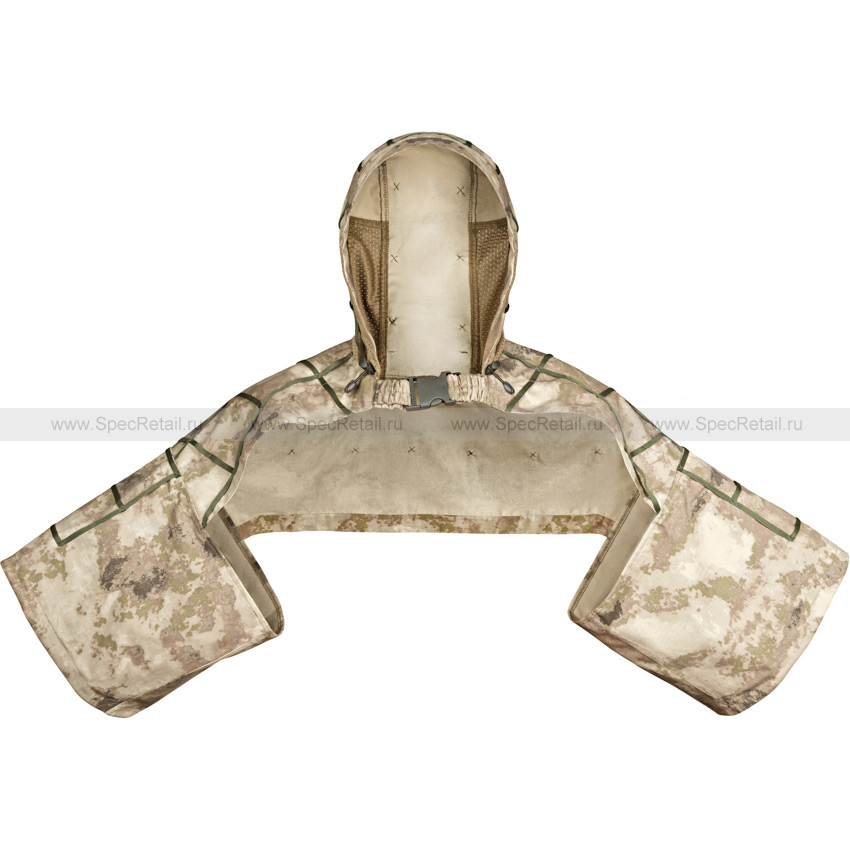 Накидка для снайпера с капюшоном, спереди можно крепить дополнительную маскировку благодаря стропам. По бокам и на лицевой стороне капюшона предусмотрены сетчатые накладки для отвода влаги и вентиляции. Капюшон имеет универсальный размер, застежка на фастекс.