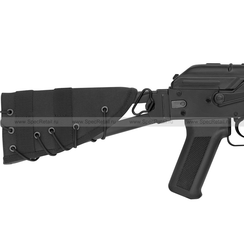 Накладка на приклад боевого, охотничьего или страйкбольного оружия серии АК, M4 и др. Устанавливается на все модели с ровным верхним гребнем. Благодаря двум стропам стандарта MOLLE появляется возможность разместить на накладке дополнительный подсумок под магазин или совместимое снаряжение. Ячейки на накладке расположены с двух сторон, поэтому данный аксессуар можно использовать с правого или левого плеча. Внутри накладки находится тонкая прокладка из пенки, тем самым, она защищает приклад от ударов и падений. Накладка фиксируется эластичным шнуром, который обхватывает нижнюю часть приклада. Шнур снабжен фиксатором.