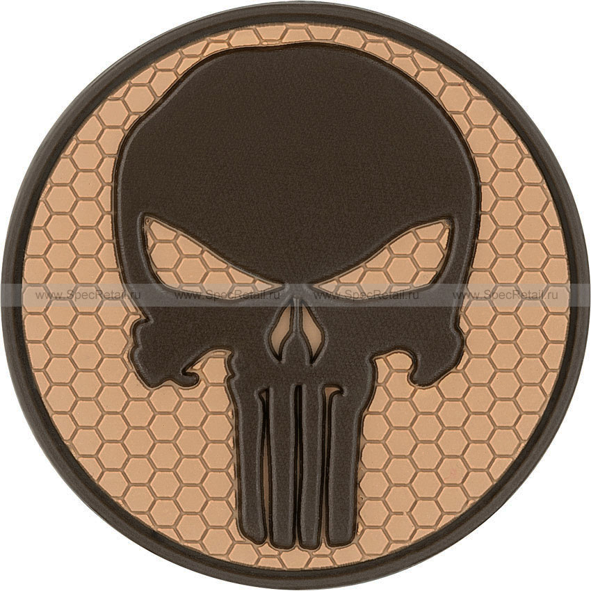 Патч с изображением эмблемы персонажа популярной серии комиксов "The Punisher" – черепа Карателя. Вымышленный персонаж Фрэнк Касл, который и является Карателем, – это по сути антигерой вне закона, который борется с преступным миром, используя их же жестокие методы. Фон песочного цвета представляет собой сеть из множества мелких шестиугольных сот. Крепление посредством велкро-липучки на обратной стороне шеврона.