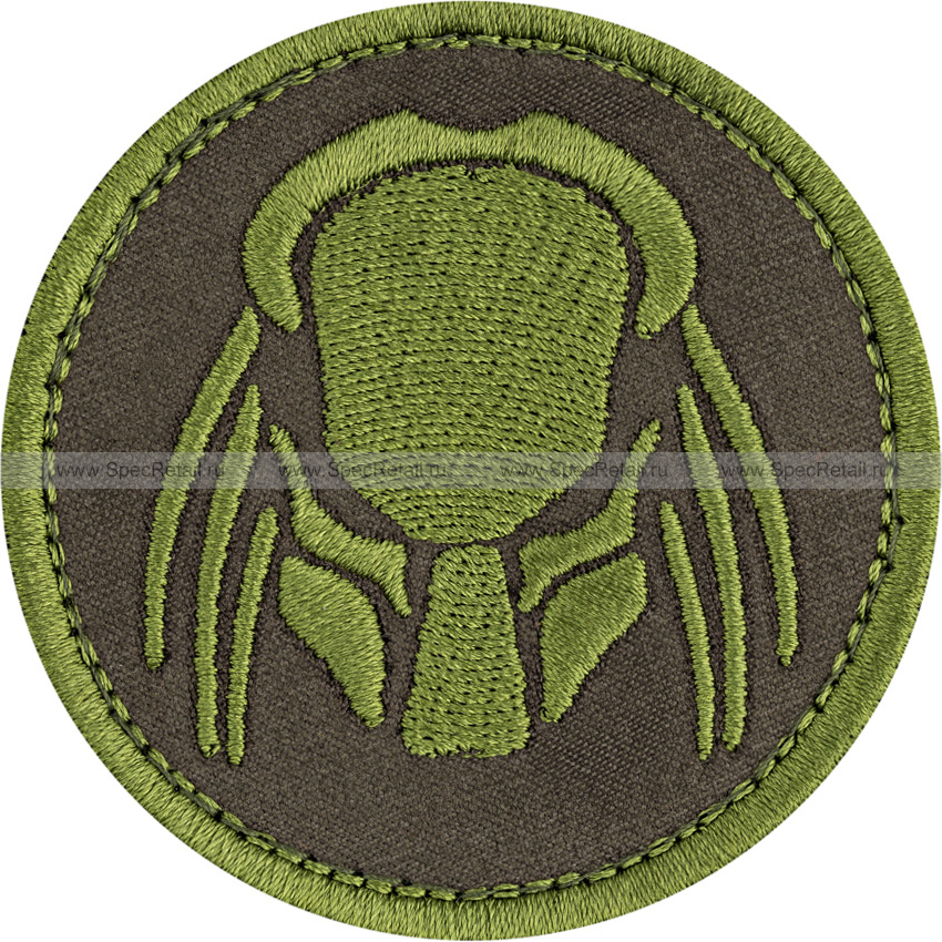 Патч круглой формы с изображением фантастического персонажа культового фильма "Хищник". Представлен в цвете олива.