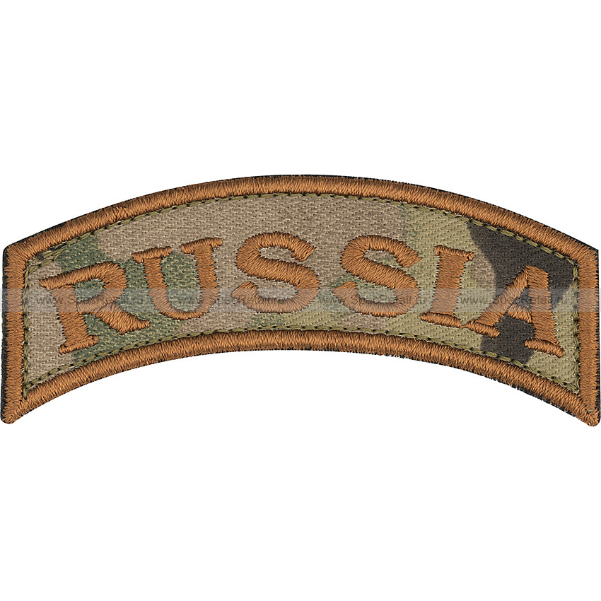 Текстильный патч, на котором вышита надпись "Россия" на английском языке (Russia). Шеврон выполнен в форме дуги. На обратной стороне изделия пришита велкро липучка (микрокрючки), которая служит для закрепления на одежде, снаряжении или рюкзаке.