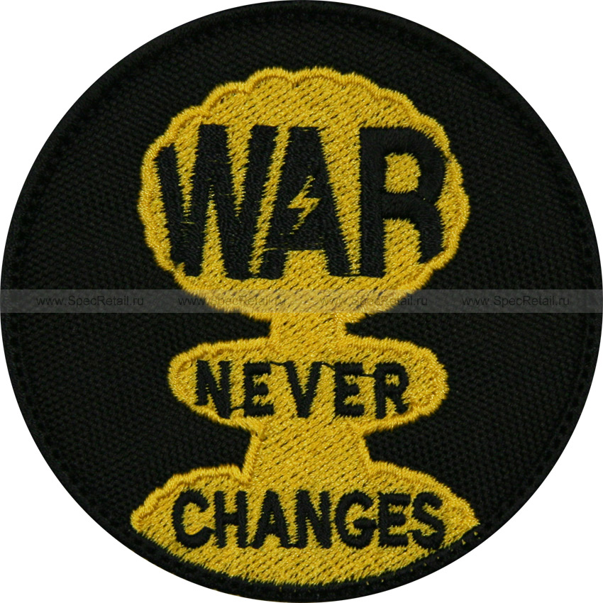 Шеврон с надписью "War never changes" (война никогда не меняется) и ядерным грибом. Сделан из плотных и качественных нитей.По краям усилен оверлоком. На обратной стороне пришита велкро-липучка.