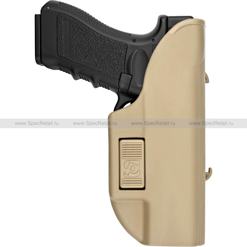 За счёт максимально плотной посадки пистолета в кобуре и наличия фиксирующей защёлки в зоне защитной скобы спускового крючка оружие не болтается, а вероятность его утери сведена к минимуму.