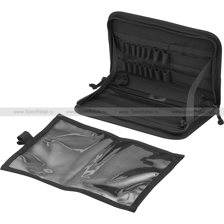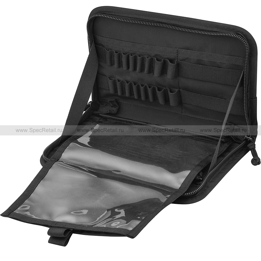 Пришитые на одной из внутренних стенок планшета эластичные ленты-резинки позволяют зафиксировать письменные принадлежности, блокнот, фонарик, мультитул и другое имущество. Таким образом, представленный планшет можно использовать в качестве, своего рода, тактического пенала. Внутри стенки планшета соединены двумя прочными стропами, что позволяет распахнуть изделие на манер чемодана. Поверхность стенок ровная и достаточно твёрдая, благодаря чему можно комфортно работать с документами и бумагами, а также осуществлять записи.