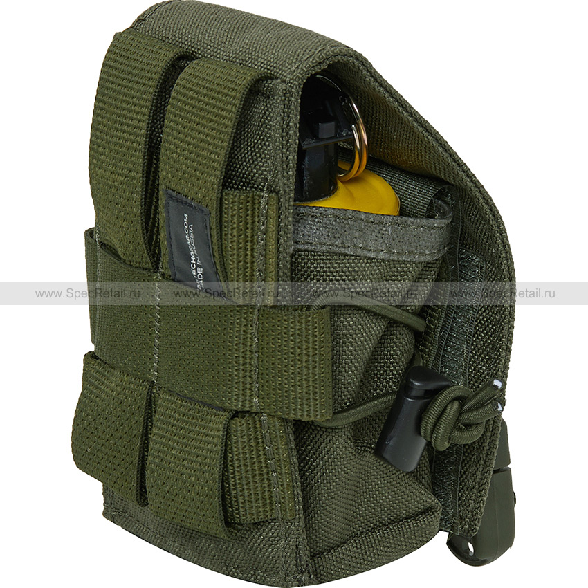 Универсальный подсумок под одну гранату, которая помещается в единственное отделение, закрывающееся сверху на клапан. Клапан подсумка имеет двойную систему фиксации в закрытом положении, которая сводит до минимума вероятность утери содержимого: фастекс + велкро застёжка. На внутренней стороне клапана нашита текстильная лента с микрокрючками (велкро липучка), а снаружи на клапане на стропе располагается гнездовая часть фастекс застёжки, к которой присоединяется её трехзубая часть, закреплённая на стропе в нижней части подсумка.