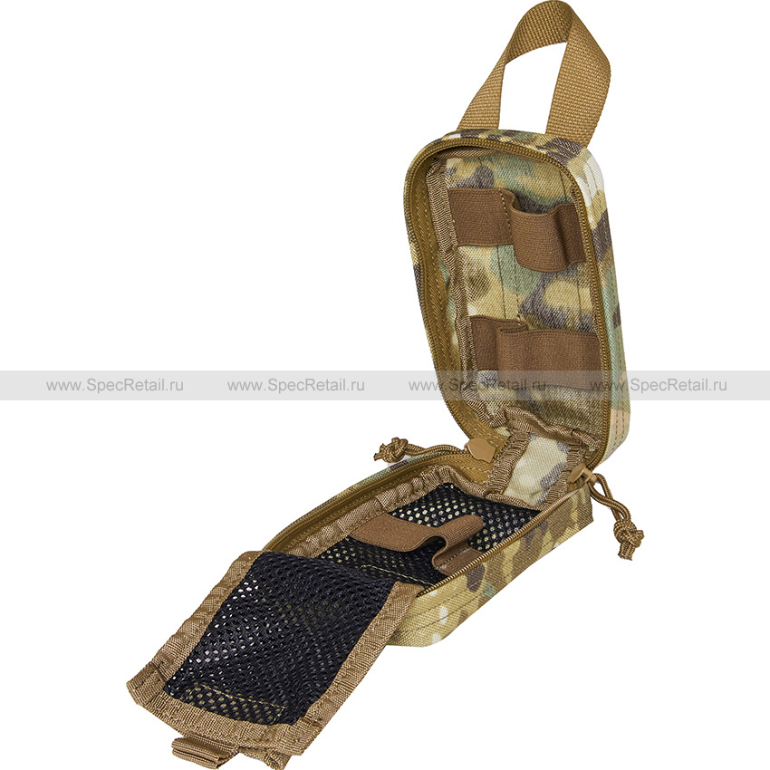Подсумок оснащён удобным внутренним органайзером в виде эластичных лент, нашитых на стенках. Резинки надёжно удерживают всё самое необходимое медицинское оборудование, препараты, перевязочные материалы и различные вспомогательные аксессуары, которые могут потребоваться для оказания первой помощи. Несущая платформа служит для крепления переносной аптечки на любом МОЛЛЕ совместимом снаряжении: на обратной стороне платформы пришиты две вертикальные стропы.
