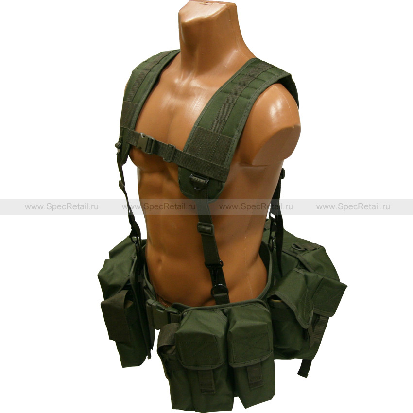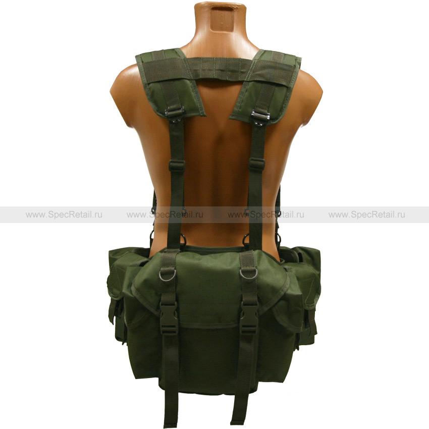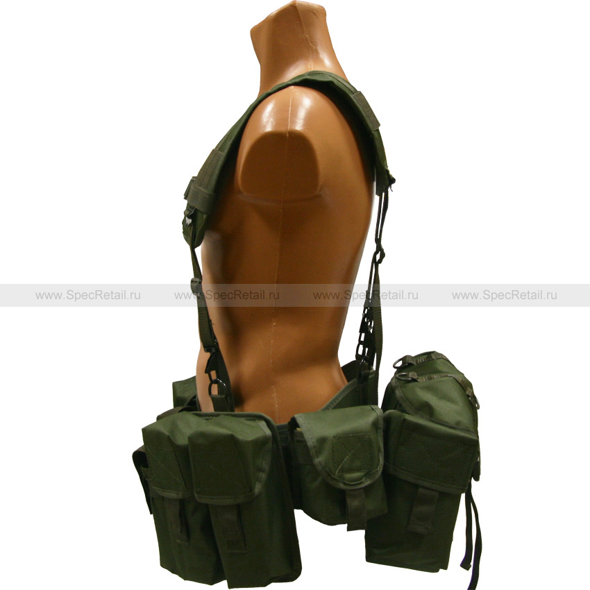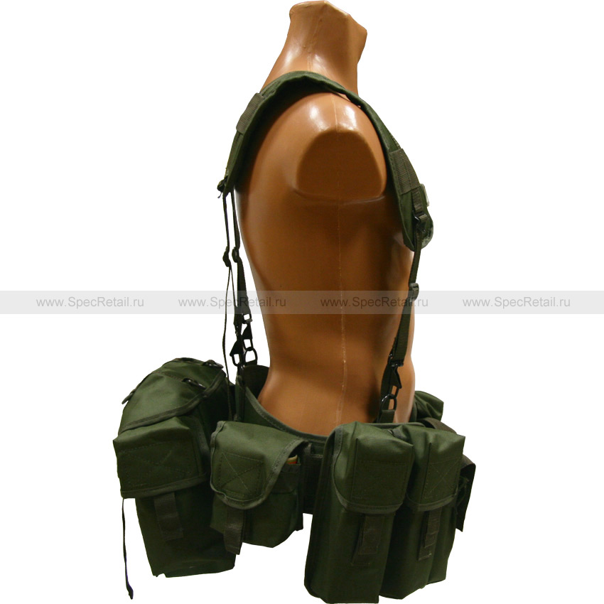 Надежная и качественная разгрузочная, ременно-плечевая система для автоматчика. Вмещает до 12 магазинов серии АК, а также множество необходимого снаряжения. Система представляет из себя пояс, к которому крепятся подсумки и плечевую систему, закрепляемую к поясу. Разгрузка очень удобная, не стесняет движений, все подсумки и их содержимое под рукой и может быть быстро извлечено. В оружейных подсумках имеются люверсы для слива воды.
