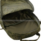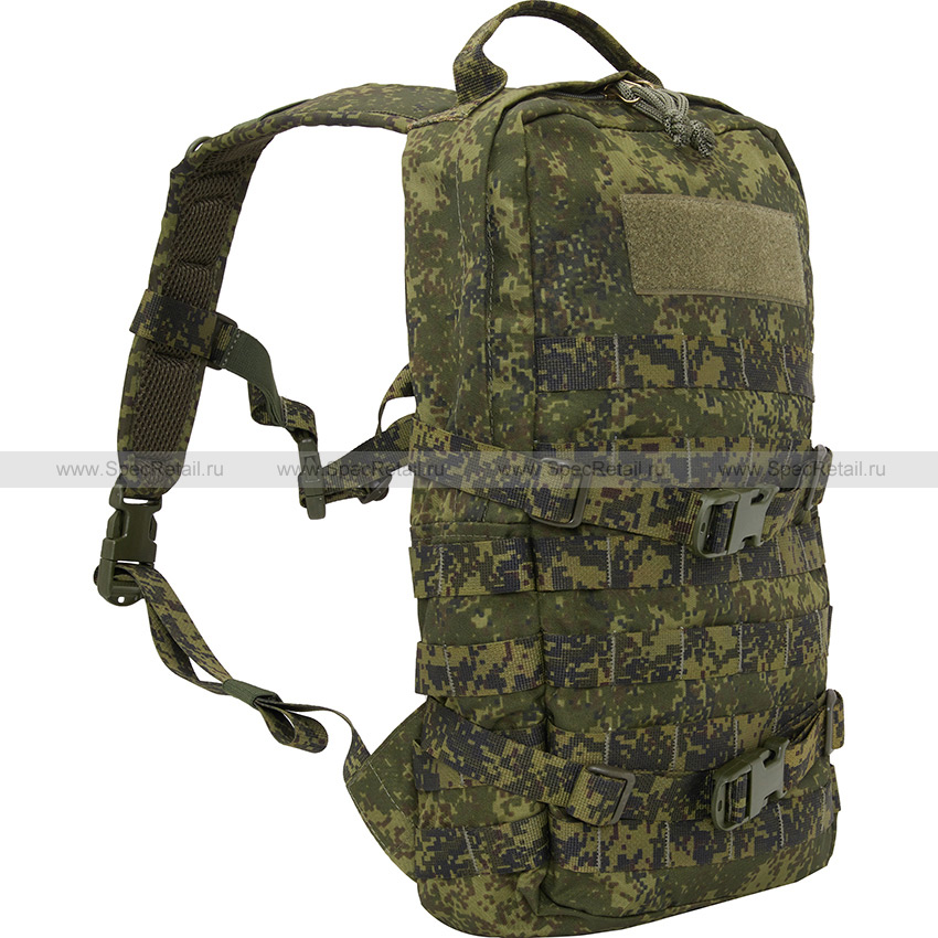 На лицевой стороне рюкзака есть два компрессионных ремешка, застёгивающихся на фастекс застёжку, с помощью которых можно корректировать объём рюкзака, а также использовать их для крепления габаритных элементов снаряжения, например, походной лопаты, котелка, коврика, каремата и т.д. Сверху пришита велкро панель для крепления патчей и знаков различия с велкро липучкой, а также есть ручка для переноски.