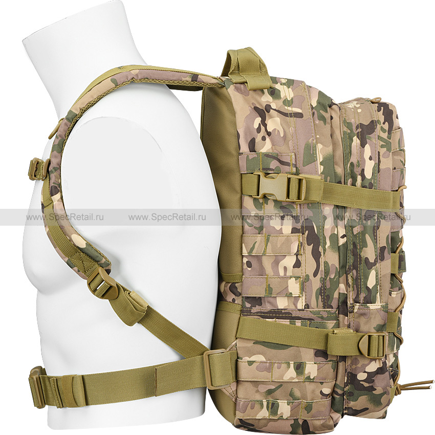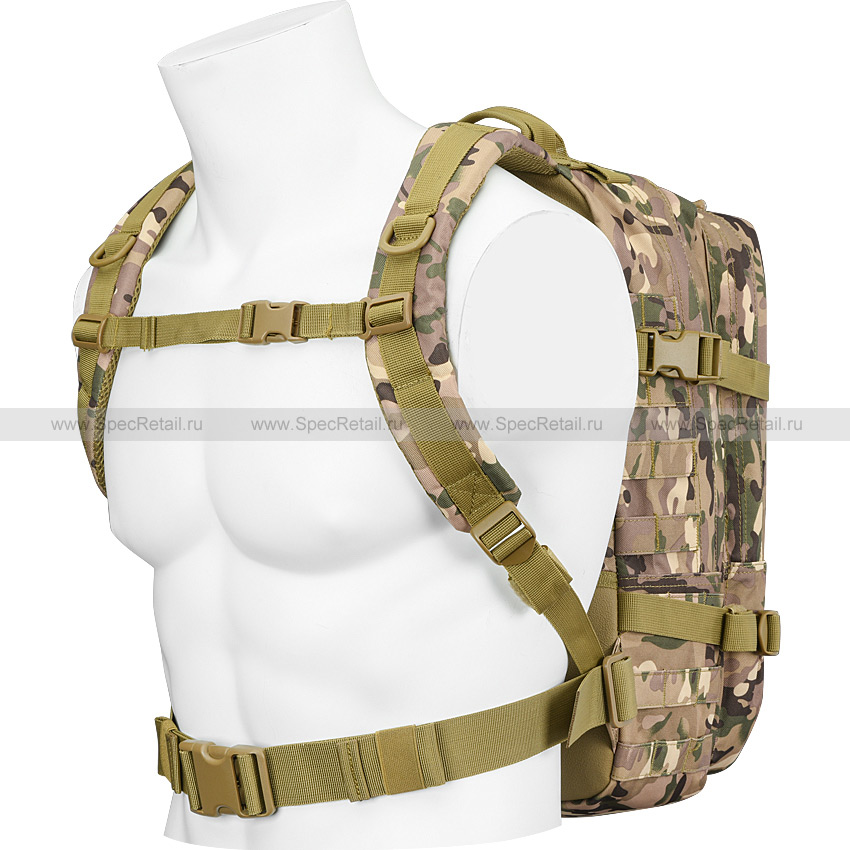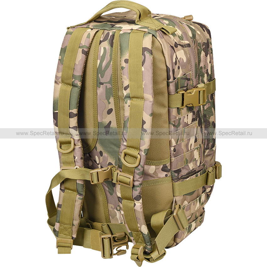 Лицевая сторона рюкзака испещрена MOLLE ячейками, которые позволяют навесить дополнительное совместимое снаряжение. Для регулировки объёма рюкзака по бокам есть стропы-ремешки. Плечевые лямки регулируются по длине, оборудованы грудной перемычкой на фастексе. Внутренняя поверхность лямок выполнена из смягчающей сетки, а на спинке рюкзака есть вставки для комфортного ношения. В верхней части корпуса имеется прочная ручка, а внизу – поясной ремень на пластиковой фастекс застёжке ("трезубец"). Эластичный шнур на фронтальной стороне рюкзака, пропущенный через специальные петли, позволяет закрепить коврик, пенку, каремат, дождевик.