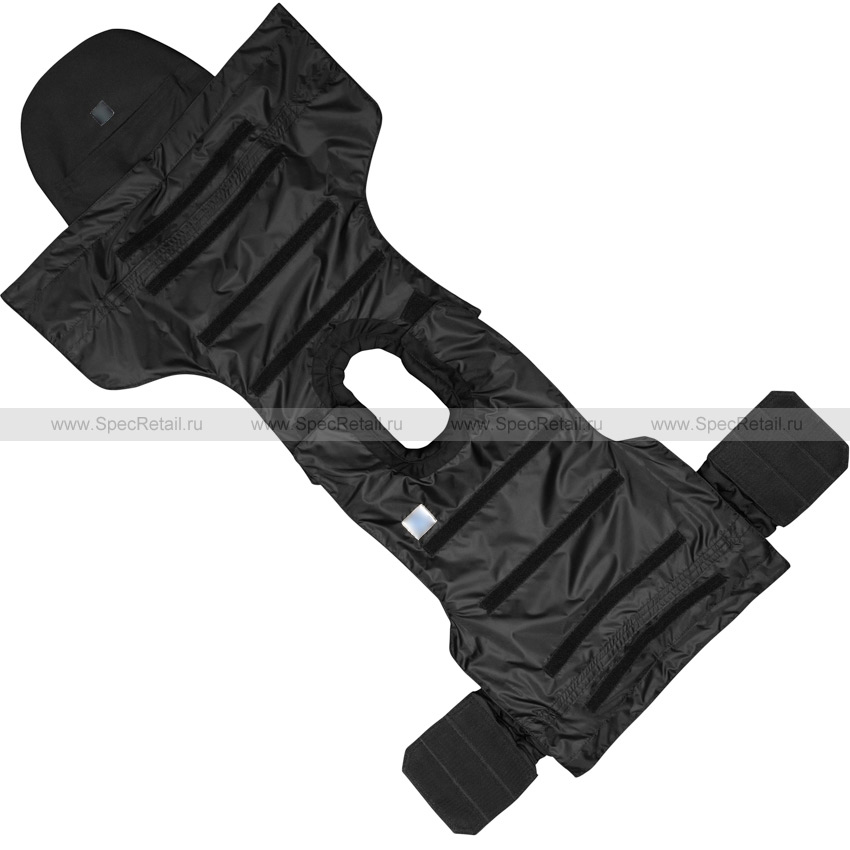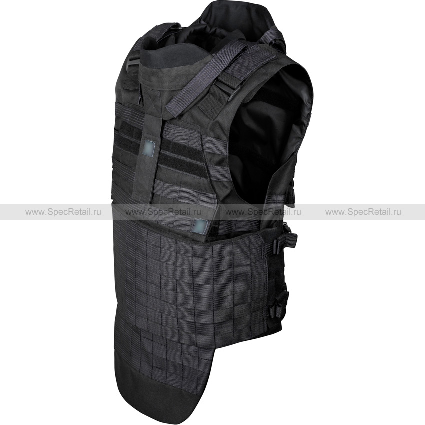 В конструкции жилета предусмотрены съёмные элементы: напашник и воротник. Отсеки для установки бронепластин расположены на фронтальной и задней частях чехла. Жилет можно настроить под параметры владельца с помощью изменения длины ремешков – в области воротника и на поясе. Подходит для размеров от 52 до 62.
