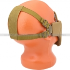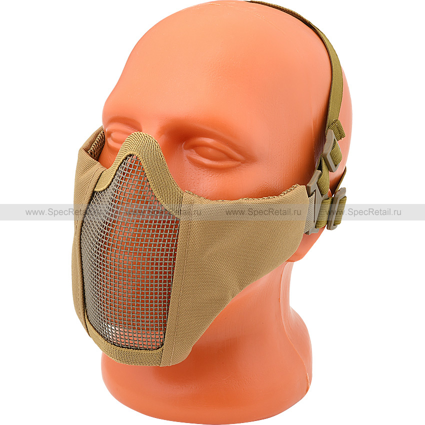 Защитная маска для занятий страйкболом. Конструкция маски представляет собой комбинацию стальной сетки, препятствующей попаданиям пластиковых 6 мм шаров в область носа, губ и зубов, а также тканевых накладок – по бокам – для защиты щёк и скул. Для фиксации маски к тканевым стенкам прикреплены два эластичных ремешка, соединённых прямоугольной текстильной перемычкой. За счёт регулировки длины ремешков пользователь может подобрать объём обхвата и силу прижатия маски, исходя из индивидуальных предпочтений.